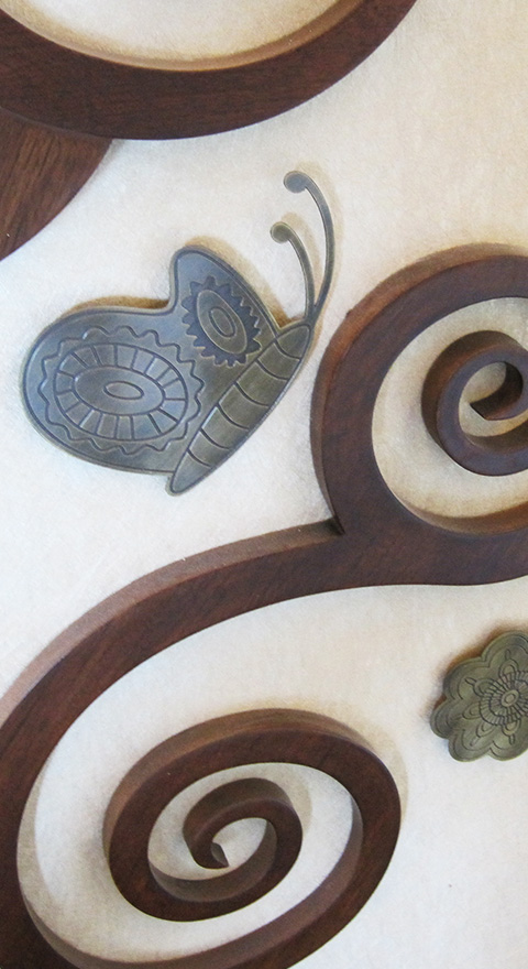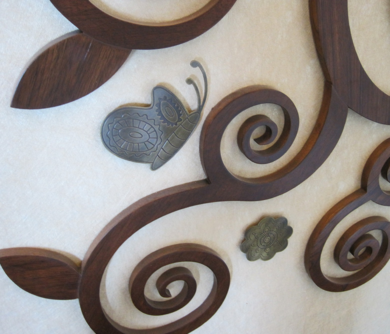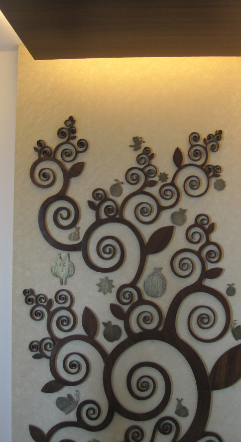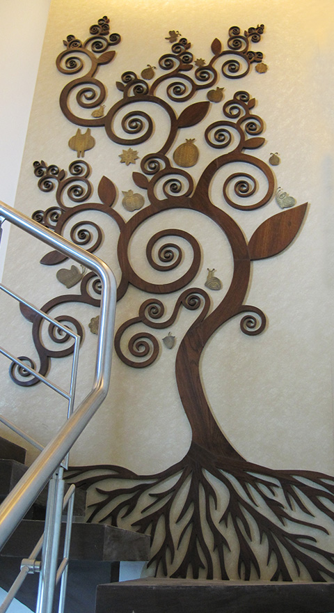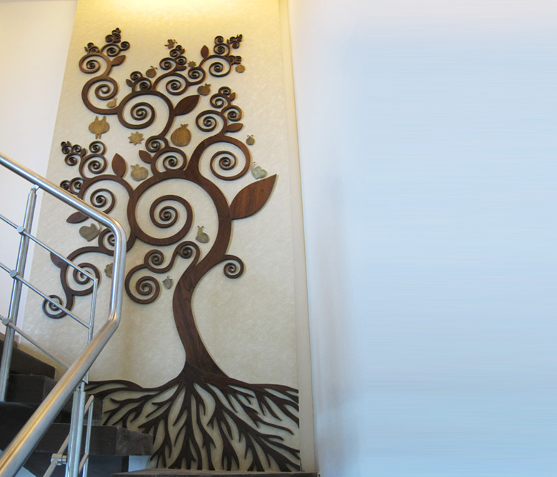 The artwork was cut in CNC router, using material of the 15mm thick teak wood. Fixing of the same was done with rear side fixture. Finished with natural varnish finish. The small installations on the branches and the leafs were done in brass etching and fixed directly with rear nails.